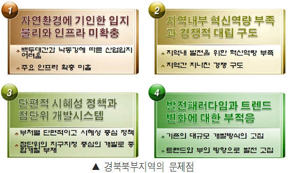 경북북부지역의 문제점 그동안 정부에서는 다양한 지역발전과 관련한 정책을 수립했지만 낙후지역 해소를 위한 실제 정책집행과정에서 많은 문제점이 드러나게 되었다.