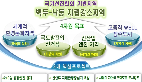 지금까지의 낙후지역개발은 국지적․개별적․단편적으로 추진되어 사회간접자본이 계획적․광역적으로 연계되지 못하고, 인근 시군간 사업 중복 등 비효율을 양산하는 구조를 내포하고 있었다. 경북 북부지역은 수도권 경제력 집중, 경부축과 남서해안축 등 발전축으로부터 원격 등으로 인해 우리나라에서 대표적인 광역적 낙후지역으로 분류되고 있다. 지역발전의 비전과 전략 이러한 문제점의 인식에 따라 북부발전협의회는 경북북부지역의 발전전략을 수립하고 추진함으로써 진정한 지역균형발전을 달성하기 위해『국가선진화의 기반지역 백두-낙동 자립강소지역』을 비전으로 설정하고 이를 실천하기 위한 핵심 3대 프로젝트로, 21C형 성장엔진 탑재, 신한류 국제관광중심지 육성, 사람과 자연이 조화로운 도시 창조를 선정했다.