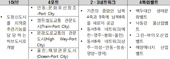 이와같은 비전을 달성하기 위해 경북북부권의 공간을 1허브, 4포트, 2×3 네트워크, 4특화벨트로 구성했다.