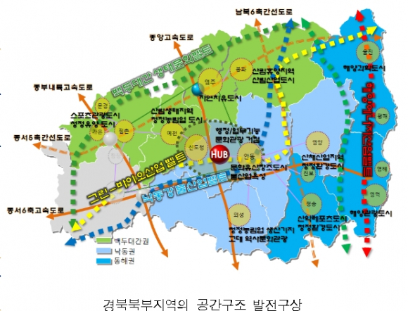 경북북부지역의 중심지역이고 낙동강과 낙동정맥에 의해서 형성된 안동, 의성, 영양을 낙동권으로 설정해 생명산업과 물산업, 문화산업을 성장동력을 활용하고, 낙동정맥의 동쪽에 위치하고 동해에 연접한 울진, 영덕, 청송을 동해권으로 설정했다.