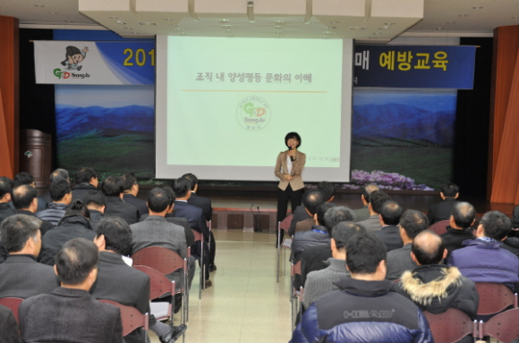 |  | | | ⓒ GBN 경북방송 | | 이날 교육은 ㈜월드개발그룹 이사 민세원 전문강사를 특별초빙해 간부공무원 및 직원 200여명이 참석한 가운데 “조직내 양성평등 문화의 이해”란 주제로 2시간여에 걸쳐 진행되었으며,
