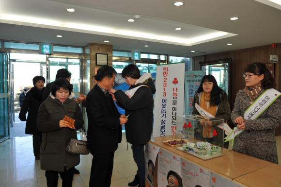공무원들의 솔선 자율참여를 위해 12월 4일 오전 8시부터 시청, 보건소, 농업기술센터 등에서 출근하는 직원들을 상대로 사랑의 열매 달아주기 행사를 실시했다.