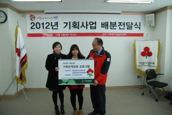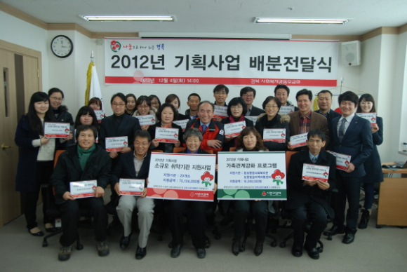일시 : 2012.12.04(화) 14:00~15:00 장소 : 경북사회복지공동모금회 대회의실 참석자 : 2012년 기획사업 사업수행기관 대표자 및 실무자 30명 최해윤 경북사회복지공동모금회 사무처장 내용 : 2012년 기획사업 배분전달식 배분액 : 9,100여만원 지원대상 : 2012년 기획사업 선정기관 22개소 |