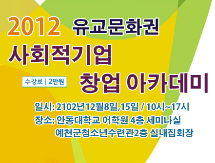 (재)세계유교문화재단은 유교문화권 문화기업 육성을 위한 ‘2012 사회적기업 창업 아카데미’를 오는 12월 8일(토), 15일(토) 2회에 걸쳐 안동시(안동대학교 어학원 4층 세미나실)와 예천군(예천군 청소년수련관 2층 실내집회장) 두 곳에서 동시에 진행된다.