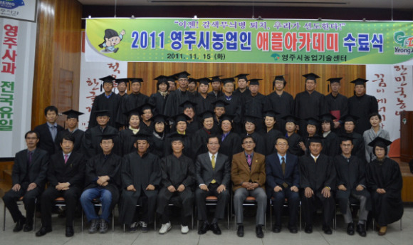 전문농업인력 양성의 산실로 자리 잡은 영주시 농업인 사과대학 수료식이 1년 동안의 과정을 마치고, 기초과정 55명, 심화과정 35명 총 90명의 수료생과 내빈 등 100여명이 참석한 가운데 12월 7일 오후 2시에 사과대학총장인 영주시장의 격려사와 함께 또 다른 시작의 의미인 수료식을 갖는다.