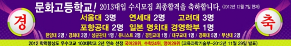문화고(교장 김승환)가 올해 서울대 합격생 3명을 배출해 화제가 되고 있다. 지난 7일 발표된 2013서울대 수시모집에서 문화고 3학년 최현준(미학과), 김재정(전기전자공학부), 박병준(컴퓨터공학과) 군이 최종 합격하는 쾌거를 이루었으며, 이 밖에도 연․고대, 포항공대 등 다수의 명문대학 합격생을 배출하며 명문 사학의 위상을 다시 한번 드높였다. 문화고가 매년 대입에서 우수한 성적을 거둔 것은 교사들의 학생지도에 대한 뜨거운 열정과 개개인의 수준별로 나눠 진행한 눈높이 맞춤식 수업 때문이다.