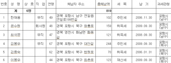 포항시가 지방세 고액․상습 체납자에 대한 경각심 및 납부의식 고취를 위해 10일 포항시 홈페이지를 통해 체납자 명단을 전국에 공개했다.