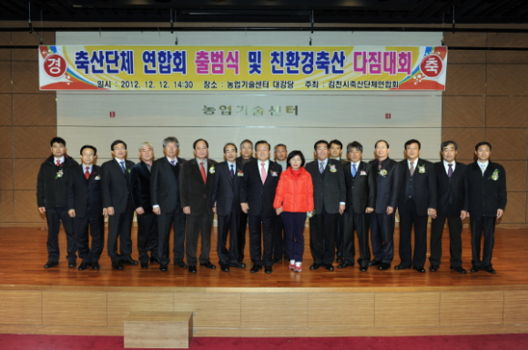 김천시(시장 박보생)는 12일(수)일 김천시 농업기술센터 대강당에서 김천축산단체연합회(회장 이조용) 주관으로‘김천축산단체연합회 출범식 및 친환경축산 다짐결의대회’를 갖고 김천축산단체연합회를 공식 출범했다.