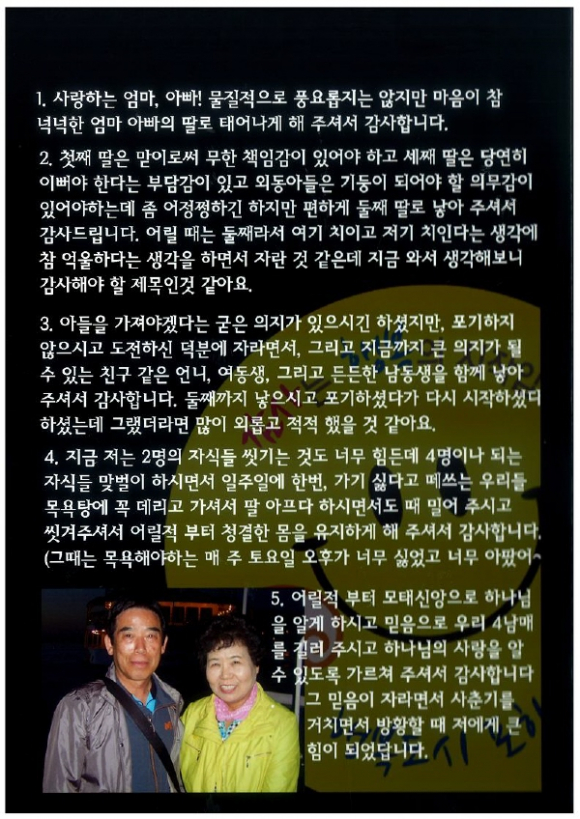 엄마 아빠의 딸로 태어나게 해주셔서 감사합니다. 아버지 예순아홉 번째 생일맞아 100감사 포트북으로 선물