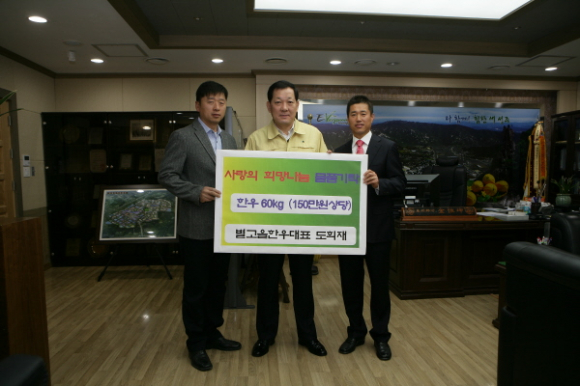 성주 별고을 한우 (대표 도희재)에서 12월 13일 성주군청을 방문해 관내 다문화가정,조손가정 및 한부모 가정,독거노인 등 100가구를 선정해 전해 달라며 한우 60kg(싯가 1백5십만원 상당)을 성주군에 기탁했다.