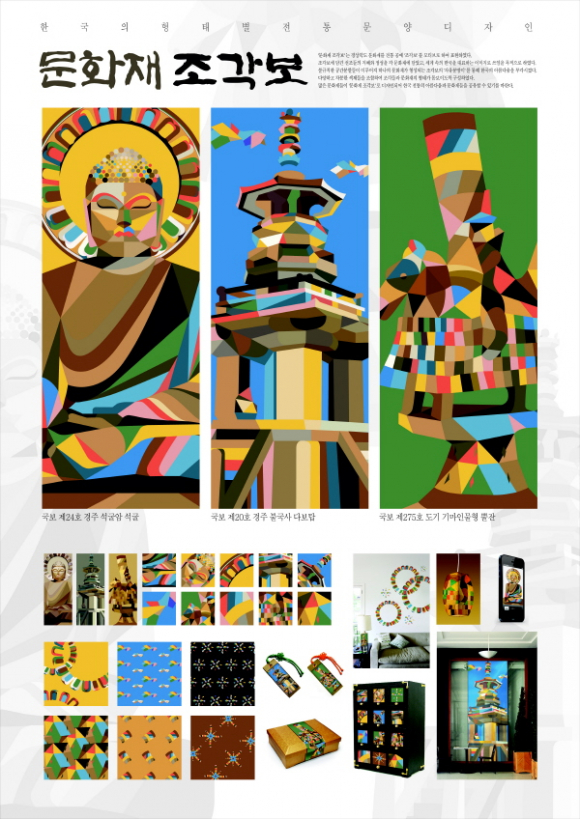 |  | | | ⓒ GBN 경북방송 | | 11월 7일(수)과 15일(목) 전통문양디자인 및 캐릭터디자인 작품을 심사한 결과 ‘전통문양디자인’ 대상 작품으로 김상미씨의 ‘문화재 조각보’가 선정된 것을 비롯해 금상 1점, 은상 1점, 동상 3점, 장려상 5점, 특·입선 131점의 입상작이 선정됐다. ‘캐릭터디자인’ 대상은 김신아씨의 ‘경상북도의 전통과 멋’이 선정되었으며 금상 1점, 은상 1점, 동상 3점, 장려상 5점, 특·입선 140점이 입상작으로 선정됐다.