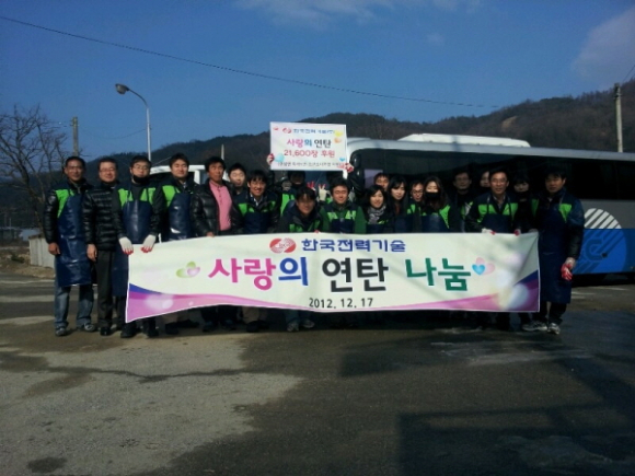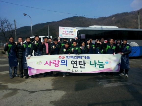 김천혁신도시 이전 공공기관인 한국전력기술(사장 안승규)은 12월17일 유선용상무을 비롯한 임직원 30여명이 참여한 가운데 김천시 구성면에서 어려운 주민들이 따뜻한 겨울을 날 수 있도록 ‘사랑의 연탄 나눔’ 봉사활동을 펼쳤다.