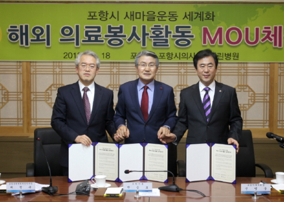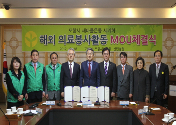 포항시는 포항시의사회, 포항선린병원과 공동으로 박승호 포항시장, 신명준 의사회장, 채정욱 재단이사장과 새마을회 회장단 등이 참가한 가운데 해외 의료봉사활동 업무 협약식을 가졌다.
