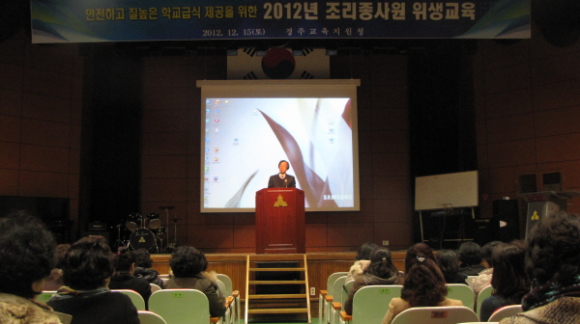 경주교육지원청(교육장 손수성)은 지난 12월 15일(토) 경주고등학교 괘정관에서 유치원․ 초․중․고․특수학교 조리종사원 360명을 대상으로 학교급식 만족도 향상 및 안전하고 질 높은 급식 제공을 위해서 위생․안전 교육을 실시했다.