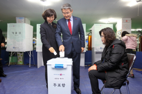 박승호 포항시장이 19일 부인 이하옥 여사와 함께 용흥동 제4투표소(우방타운 문화회관)에서 오전 9시께 투표를 한 뒤 기표용지를 투표함에 넣고 있다.