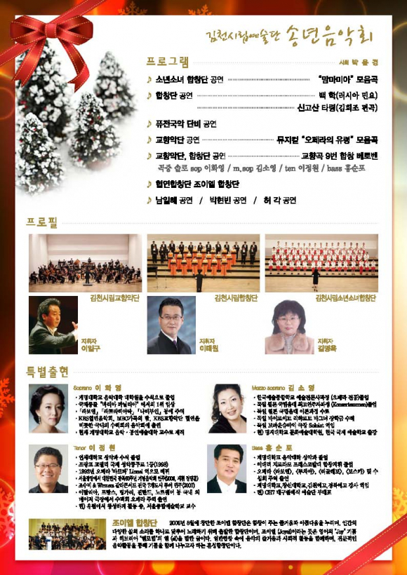 1부는 시립소년소녀합창단의 뮤지컬『맘마미아』모음곡과 시립합창단의 공연으로 시작하며 퓨전국악팀 단비의 공연으로 흥을 돋우며 이어서 이번 공연의 하이라이트인 김천시립합창단과 시립교향악단, 그리고 성악가 4명과 조이엘 합창단의 합동공연 베토밴 9번 교향곡『합창』을 연주해 시민들에게 깊은 감동을 선사한다.한다. 2부로는 인기 가수 허각과 트로트 황태자 박현빈 그리고 어르신들의 향수를자극하는 가수 남일해가 특별출연해 히트곡들로 흥겨운 무대를 선사할 예정이다.