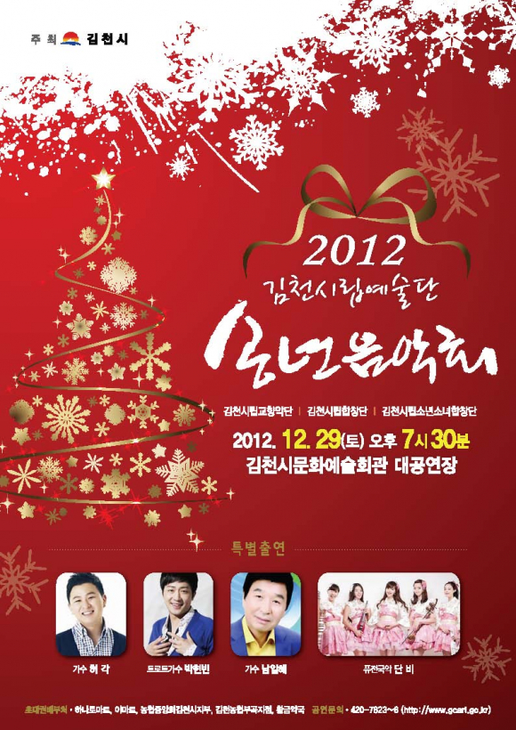 김천시에서는 오는 12월 29일 저녁7시30분 김천시문화예술회관 대공연장에서 한해를 마무리하는『2012 김천시립예술단 송년음악회』를 개최한다.