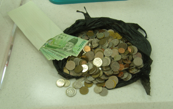 |  | | | ⓒ GBN 경북방송 | | 이 여성이 전달한 비닐봉지 안에는 만원권 지폐 몇 장과 동전이 가득 담겨져 있었으며, 이 금액은 경상북도사회복지공동모금회에 성금으로 접수했다.