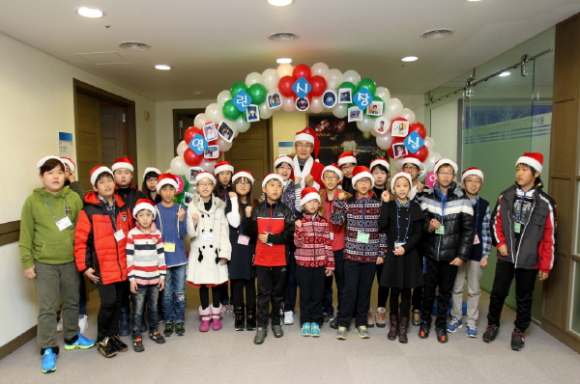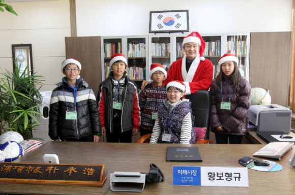 박 시장은 22일 ‘열린 시장실’ 행사에서 산타클로스 복장을 하고 참석 학생들을 맞이했다.