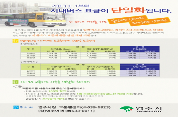 영주시(시장 김주영)는 내년 1월1일부터 시내버스 요금이 단일화 된다고 밝혔다.