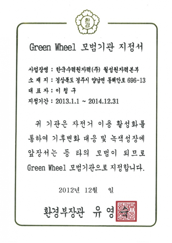 |  | | | ⓒ GBN 경북방송 | | 월성원자력은 사내 업무용 자전거 및 보관시설의 확충, 자전거이용자 생활수기 공모와 서명운동, 자전거 동호회와 지역사회 자전거 관련 행사지원 등 자전거 장려정책을 꾸준히 펼친 결과 그린휠 모범기관으로 지정받게 되었다 서의석 방재환경팀장은 그동안 녹색기업 지정, 환경경영체제(ISO14001) 인증에 이어 이번 그린휠 모범기관 지정을 계기로 친환경기업이라는 이미지를 확고하게 정착시킬 수 있게 되었다고 말했다. |