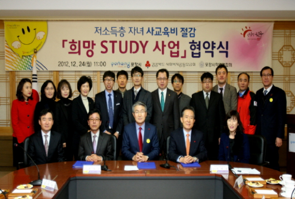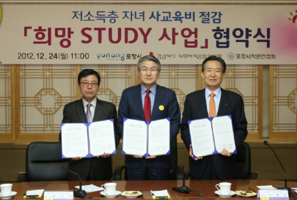 포항시와 포항시 학원연합회(회장 홍순복), 경상북도 사회복지 공동모금회(회장 이대공)는 24일 포항시청에서 경제적인 어려움으로 학원에 다니지 못하는 저소득층 학생들의 학원수강료 감면을 위한 희망STUDY 사업 협약식을 체결했다.