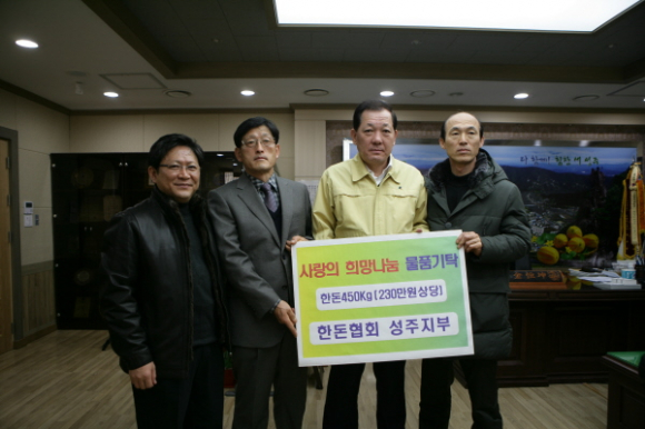 (사)대한한돈협회 성주군지부(지부장 윤준호)에서 12월 24일 성주군청을 방문해 관내 다문화가정, 조손가정 및 한부모 가정,독거노인 등 90가구를 선정해 전해 달라며 한돈(국내산 돼지고기) 450kg(싯가 230만원 상당)을 성주군에 기탁했다.
