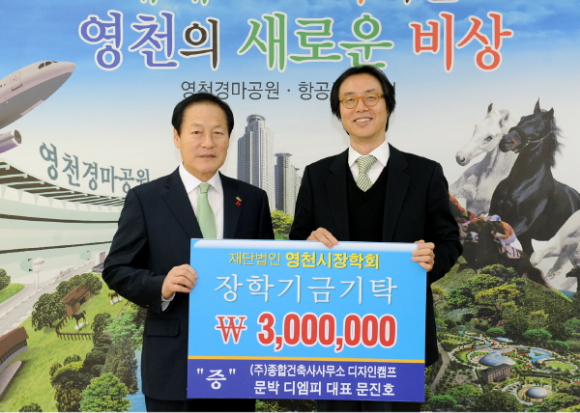 (주)종합건축사사무소 디자인캠프 문박 디엠피는 건축설계 및 감리업체로 문진호 대표는 “영천에서 사업을 하면서 지역의 장학회 소식을 접하고 장학사업에 관심이 생겨 기탁하게 되었다.”고 말하며 “앞으로 승승장구하기를 바란다.”고 전했다.