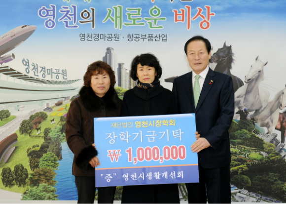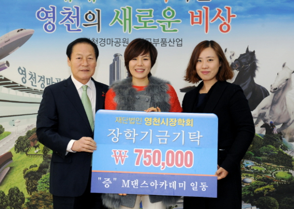 연말을 맞아 장학기금 기탁이 하루도 빼놓지 않고 릴레이처럼 이어지고 있다. 12월 26일 영천라이온스클럽에서 100만원, (주)종합건축사사무소 디자인캠프 문박 디엠피(대표 문진호)에서 300만원, 영천시생활개선회에서 100만원, M댄스아카데미 일동이 75만원, 영천시공립어린이집연합회에서 120만원, (주)세계주철(대표 최익구)에서 300만원의 장학기금을 기탁했다.