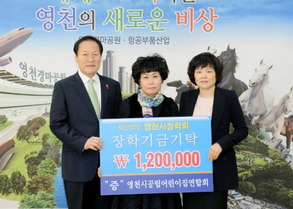 |  | | | ⓒ GBN 경북방송 | | 영천시공립어린이집연합회는 지난 2010년부터 장학기금을 기탁해 오고 있으며, 이경란 회장은 “열심히 공부하고 노력하는 학생들에게 조금이나마 도움이 되길 바라며 해를 거듭할수록 성장하는 장학회와 함께 영천교육도 발전하기를 바란다.”고 전했다.