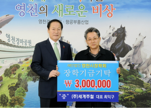 |  | | | ⓒ GBN 경북방송 | | 대창면 어방리의 (주)세계주철은 1999년 설립된 맨홀커버전문 생산업체로 소음이 없고 개폐가 쉬운 부양식 안전잠금 맨홀 뚜껑은 올해 조달청 우수조달물품으로 선정되는 등 끊임없는 기술개발과 연구로 국내 1위 업체로 발돋움 했다. 최익구 대표는 “평소 나눔과 상생을 경영의 기본으로 삼으며 지역과 함께 성장하는 기업이 되어야 한다고 생각해 장학기금을 기탁하게 되었다.”며 소감을 말했다. 김영석 이사장은 “지역사랑 장학기금을 기탁해 주신 기업인, 단체, 시민들께 감사를 드리며 기탁하신 모든 분들의 뜻이 이루어지도록 최선을 다하겠다. 여러분들의 사랑과 응원이 영천교육발전의 원동력이 된다.”며 감사의 말을 전했다.