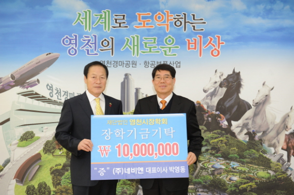 매년 이어지는 기탁에 장학기금 쑥쑥 - (주)네비엔 1,000만원, 경북자동차전문정비사업조합 영천시지회 100만원 기탁 - 12월 27일 (주)네비엔(대표이사 박영동)에서 1,000만원, 경북자동차전문정비사업조합 영천시지회에서 100만원의 장학기금을 영천시장학회(이사장 김영석)에 기탁했다.