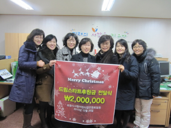 포항시 어린이집연합회 민간어린이집분과회(회장 안종순)는 취약계층 아동들의 따뜻한 겨울나기를 위해 26일 포항시 드림스타트에 후원금 2백만원을 전달했다. 민간어린이집분과회는 199개소 민간어린이집이 회원으로 구성된 포항시 보육사업의 주춧돌 역할을 하고 있으며, 지역사회 내 아동복지사업 관련된 연계기관으로 드림스타트와 긴밀한 네트워크를 형성하고 있다.
