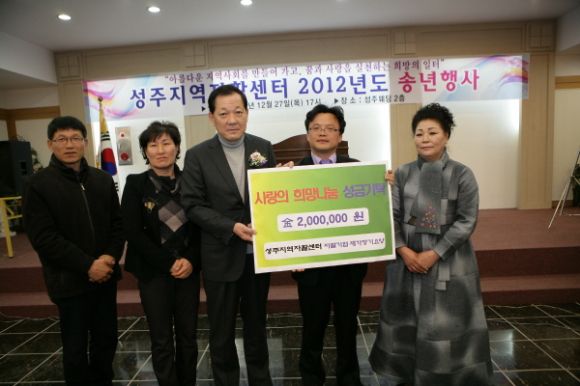 성주지역자활센터(센터장:권우성)에서 12월27일 송년의밤 행사시 자활기업 (우주인테리어, 신나는빗자루 성주점, 돌봄서비스센터)과 성주지역 자활센터 부설 재가장기요양사업 에서 정성으로 모은 수익금 2백만원 을 “희망2013 나눔 성금” 으로 성주군에 기탁했다.