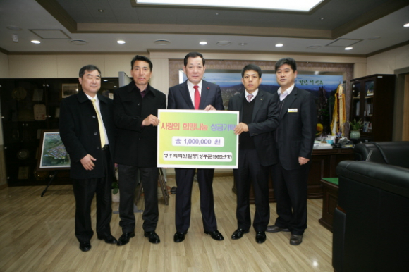 성주군의 1965년생 모임인 “성우회〃(회장:이규현)에서 12.31일 성주군청을 방문해『희망2013 나눔 성금』100만원을 성주군에 기탁했다