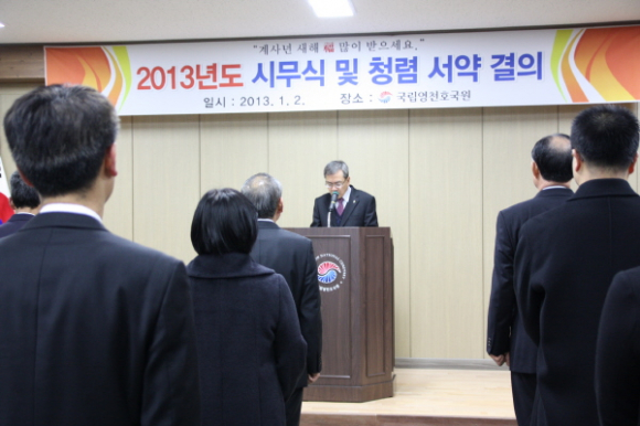 국립영천호국원(원장 노원근)은 1월2일(수) 10:00 청사 회의실에서 전 직원이 참석한 가운데 2013년도 계사년 첫 새해 시무식과 함께 반부패 청렴실천 결의대회를 가졌다.