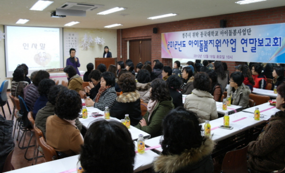 |  | | | ⓒ GBN 경북방송 | | 아이돌봄지원사업은 정부가 지난 2007년부터 부모의 야근, 입원, 출장 등 아이를 돌보지 못하는 경우 전문 돌보미 선생님이 직접 가정을 방문하거나 돌보미의 집에서 돌봄 서비스를 제공해 가정의 육아 및 양육부담을 덜어 주고자 시행한 사업으로 동국대 경주캠퍼스 아이돌봄지원사업단은 지난 2008년 4월부터 운영하고 있다. 또한, 동국대 경주캠퍼스 아이돌봄지원사업은 지난 2011년 경북 거점기관으로 지정되어 경상북도 관할 내 23개 서비스제공기관의 업무와 아이돌보미의 활동 현황 파악, 관리 지원을 겸하고 있다.