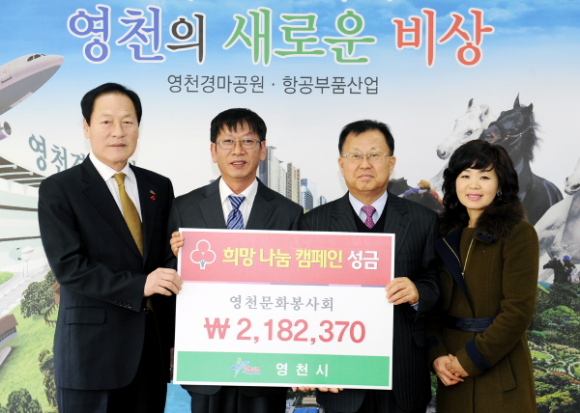 (주)세원이엔이 1,000만원, 삼녕영농조합법인 500만원, 영천문화봉사회 200만원, 광천온천랜드 100만원 기탁