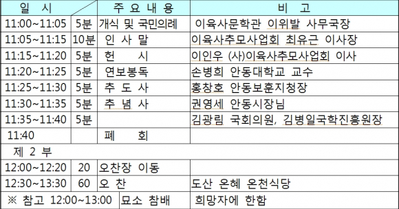 일 시 : 2013. 1. 16.(수) 11:00 장 소 : 이육사문학관 세미나실(2층) 참석인원 : 100명 정도 주최/주관 : 안동시 / 이육사문학관 주요참석 : 김광림 국회의원, 김근한 시의회의장, 김병일 국학진흥원장, 이옥비 여사, 홍창호 안동보훈지청장, 최유근 (사)이육사추모사업회이사장, 이육사문학관 조영일 관장 등 행사내용