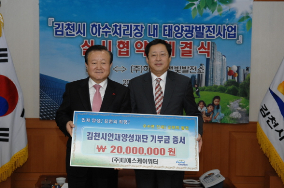 ㈜티에스케이워터(대표 김종일)는 김천하수처리장 위탁운영업체로서, 15일 김천의 교육발전과 글로벌 인재양성을 위해 김천시인재양성재단(이사장 박보생)에 장학기금으로 2,000만원을 기탁했다.
