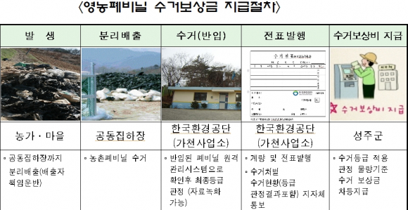 성주군(군수 김항곤)에서는 2013년 새해부터 영농 폐비닐 수거 보상금을 대폭 인상한 A급 250원, B급 150원으로 차등 지급한다. 는 지난해 Kg당 수거 보상금이 A급 90원, B급 70원을 지급한 금액에 비하면 200% 이상 인상한 파격적인 금액이다.