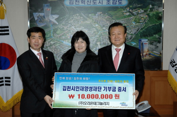 홍명옥 대표이사는 혁신도시의 성공적 건설로 새로운 도약을 준비하고 있는 김천시에 우수한 인재육성에 적극 동참하고자 장학기금 1천만원을 기탁한다고 했다. 한편 (주)오리온테크놀리지는 작년 1월에 5백만을 기탁한 바 있다.