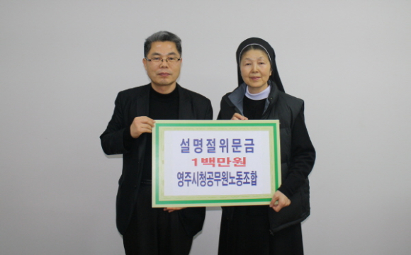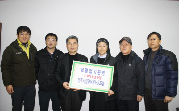 영주시청공무원노동조합(위원장 이학동)은 설 명절을 앞두고 2013년 1월 23일 영주재가노인지원센터를 방문해 우리지역 불우한 어르신300세대 떡국 배달에 필요한 설 위문금 일백만원을 전달했다.