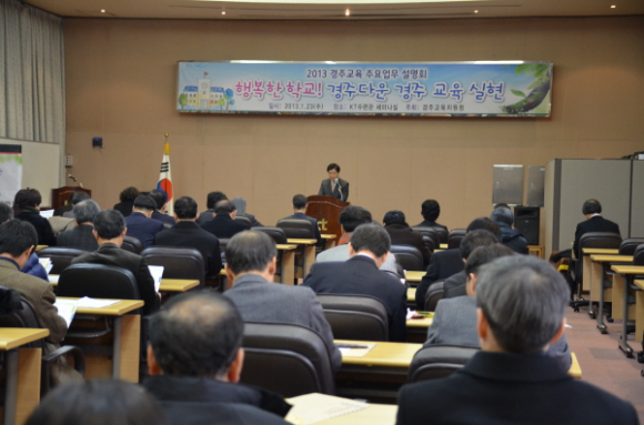 경상북도경주교육지원청(교육장 손수성)은 1월 23일(수) KT경주수련관 세미나실에서 관내 유 초 중 고등학교장을 대상으로 2013 경주교육 주요 업무 계획 설명회를 가졌다. ‘꿈과 감동을 주는 행복한 학교! 경주다운 경주교육’을 브랜드로 설정하고 ‘새로운 생각과 따뜻한 품성을 지닌 인재 육성’을 위한 2013 경주다운 경주교육 시책을 구현하기 위한 6대 과제를 발표했다.