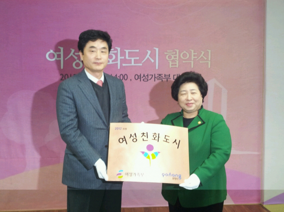 포항시가 여성가족부가 선정한 ‘여성친화도시’로 지정돼 30일 여성가족부 대회의실에서 여성친화도시 협약식을 갖고 김금래 여성가족부 장관으로부터 ‘여성친화도시 현판’을 증정 받았다.