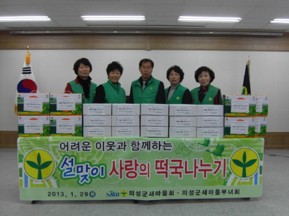 먼저, 의성군새마을회(회장 김수현)와 의성군새마을부녀회(회장 윤귀자)는 1월 29일 의성군새마을회관에서 부녀회장 6명이 참여해 『사랑의 떡국나누기』행사를 가졌다. 이날 행사에는 장애인시설인 의성읍 믿음의 집과 안사공동체등 4개 시설을 방문하여 떡국(40kg)와 음료수(베지밀240개)를 직접 전달하고 새마을가족들의 따뜻한 마음을 나누었다.