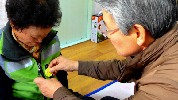 박승호 포항시장, 폐지 팔아 장학금 낸 할머니께 감사뱃지 달아드려
