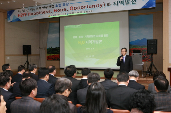 의성군청(군수 김복규)에서는 4일 오전 9시, 군민회관에서 열리는 2월 정례조회 시간에 “H2O와 지역발전”이라는 주제로 지역의 대표적 정책연구 기관인 대구경북연구원의 이성근 원장을 초청해 강의를 개최했다.