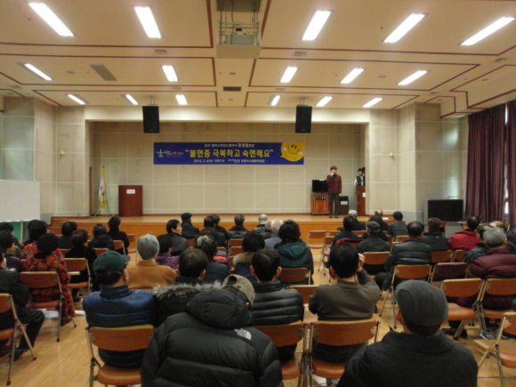 ‘불면증 극복하고 숙면해요!’라는 주제로 진행된 이날 특강은 수면무호흡, 코골이 등 수면장애의 치료법과 뚜렷한 원인 없이 1달 이상 증상이 지속되는 만성화된 불면증을 극복하는 방법에 대해 설명하고 질의․응답을 통해 평소 어르신들이 궁금해 하던 것을 해소하는 시간도 가졌다.