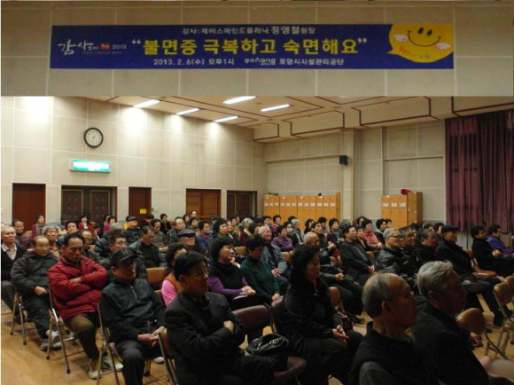 포항시 시설관리공단은 6일 노인복지회관에서 코골이나 낮졸림증으로 고통받는 어르신들을 대상으로 제이스마인드클리닉 정영철원장을 초빙해 불면증의 원인과 치료법, 생활습관에 관한 건강특강을 실시했다.